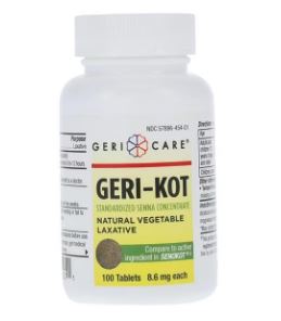 When you or someone in your family is affected by occasional constipation, you want gentle, reliable relief. The Geri-Care Geri-Kot natural laxative provides gentle relief and helps produce a bowel movement by softening stool. Natural vegetable laxative with stool softener has 8.6 milligrams of sennosides per tablet Compare to active ingredient in Senokot regular strength Laxative typically produces a bowel movement within 12 – 72 hours